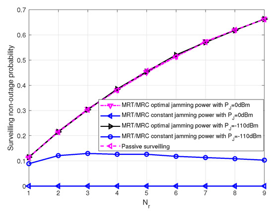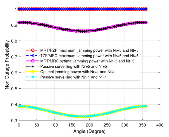 Figure 7 shows the surveilling non-outage probability versus receiving antenna number for the TZF/MRC beamforming scheme with different jamming power in the MIMO UAV. We can see that the surveilling performance decreases as the number of transmitting antennas increases, since the surveilling channel quality becomes worse, and the surveilling non-outage probability increases as jamming power increases, since the jamming effect on the surveilling link is larger than that of the suspicious link.