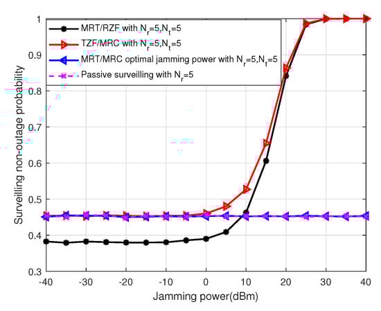 Figure 6 shows the surveilling non-outage probability versus receiving antenna numbers for the MRT/RZF beamforming scheme with different jamming power in the MIMO UAV. We can see that the surveilling performance increases as the number of receiving antennas increases, since the surveilling channel quality becomes better, and the surveilling non-outage probability increases as jamming power increases, since the jamming effect on the surveilling link is larger than that of the suspicious link.