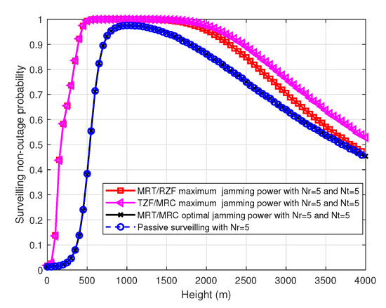 Figure 10 shows the surveilling non-outage probability versus height for the MRT/RZF beamforming scheme with maximum power, TZF/MRC beamforming scheme with maximum power, MRT/MRC beamforming scheme with optimal power allocation and passive surveilling scheme in the MIMO UAV. We can see that the MRT/RZF and TZF/MRC beamforming schemes with maximum jamming power have better surveilling performance than passive surveilling scheme. It indicates that we can use proactive jamming with MRT/RZF and TZF/MRC beamforming schemes to improve the surveilling performance. Further, the MRT/MRC beamforming scheme with optimal power allocation and passive surveilling scheme have the same surveilling performance. It indicates that we do not need proactive jamming for the MRT/MRC beamforming scheme. The reason why the surveilling performance varies with height is the same as SISO UAV.