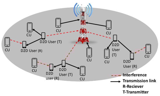The phenomenal amount of volume growth in Internet traffic is attributed to the proliferation of data-intensive applications that provide multimedia-rich services such as augmented reality, video over IP, online gaming, etc. According to CISCO, average Internet traffic is expected to grow 3.7-fold from 2017 to 2022 []. It is also estimated that mobile data traffic will increase by 77 exabytes per month by 2022, nearly a seven-fold rise above 2017 []. Furthermore, a huge number of intelligent devices are predicted to be connected to the Internet for the wide implementation of the Internet of Things (IoT). CISCO predicts that there will be around 1.5 billion IoT devices (with cellular connections) by 2020 []. Therefore, currently, as the most convenient data access method for mobile devices, the cellular networks are under immense pressure to meet the explosive data demand. The telecommunication industry and the research community need to investigate novel cellular architectures and paradigms to upgrade network capacity. In this scenario, device-to-device (D2D) communication presents one favorable solution to enhance spectral efficiency and augment capacity with minimal operational and capital expenditures. In D2D communication, the communication between two or more nearby mobile users takes place directly, i.e., without the intermediary of any infrastructure or base station (BS), which reduces communication delay, increases network throughput, and creates a cyber-physical space in a cellular environment [,,,]. In D2D, a D2D device can use one of the following mechanisms to operate. (i) Overlay mode: A D2D user is authorized to use the portion of the frequency spectrum that is not used by proximal cellular users (CU). This technique perhaps may not increase spectrum usage considering that D2D devices use a distinct resource with the CUs. (ii) Underlay mode: In underlay or reuse mode, D2D devices can use the same spectrum resource as the cellular users, on the condition of creating tolerable interference to their communication. This mode can substantially enhance system capacity. Moreover, the cellular operators can also make more profit through additional charges obtained from CUs for providing D2D service. In this paper, the focus is on the underlay spectrum sharing mode, where the D2D pairs reuse the spectrum of the CUs. One of the fundamental research challenges in reuse mode is the severe interference created in the cellular network by D2D communication due to the usage of shared spectrum resources. To ensure the quality-of-service (QoS) of cellular users, various interference mitigation techniques have been studied in the literature. In [], the authors proposed a power control mechanism to control the peak transmission power of D2D transmitters (D2DT) by the base station. In [], a more innovative technique was introduced, where resource allocation along with the power control technique was used to combat the interference from D2D to cellular users and vice versa. A spectrum splitting framework was developed in [] to minimize interference in the D2D-cellular network. To assist in the uplink transmission of CUs to BS, relay nodes were selected in [], and network coding was applied for the actual transmission. In [], a multiple-input and multiple-output (MIMO) beamforming technique for the multiple-antenna D2D underlying cellular network based on estimated channel state information (CSI) was presented.