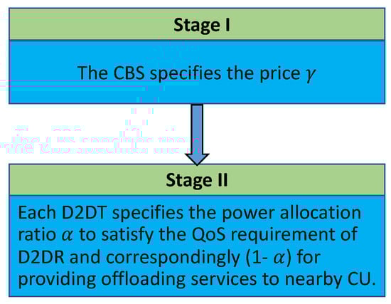 Problems in Equations (11) and (16) jointly form a Stackelberg game [], which is solved to have both D2DT and CBS act sequentially to achieve the Stackelberg equilibrium (SE), i.e., the optimal price and fraction of power resources allocated to D2DT and offloaded CU by optimizing their respective utilities.