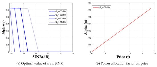 Figure 3b shows the relationship between the power allocation factor and the price . Since CBS charges D2DT for the price of creating interference at it, the relationship observed is linear. When increases, the price increases because now, D2DT allocates more power to its D2DR, which will naturally increase the interference at the CBS side; hence, the price increases.