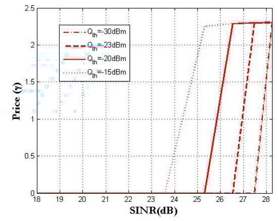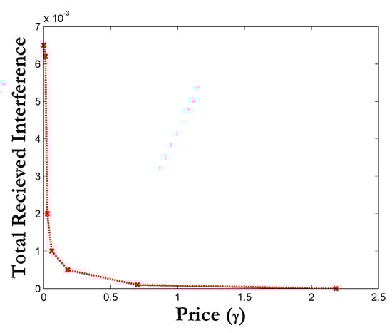 Figure 6 plots a very interesting relationship between interference created at CBS and the price . As the distance starts to increase (SINR increases), D2DT tries to dedicate more power to its D2DR (by increasing ), but in this process, the CBS charges it more price, to control it from allocating too much power to its own user. Figure 7 depicts the influence of price on the total received interference. One can observe that the aggregate interference starts high, but it decreases as more price is charged.