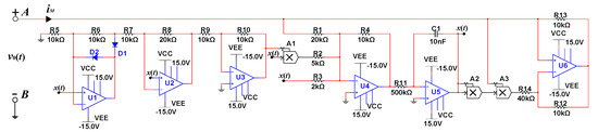 Thus, a memristive emulator based on Equation (9) was devised, which was composed of six operational amplifiers, three multipliers, and some resistors as shown in Figure 2. The voltage v 0 ( t ) between nodes A and B is the input of the emulator. Define the output voltage v U 5 of the amplifier U5 as the internal state x(t) of the memristor. When the output voltage x(t) of the amplifier U5 passes through an absolute circuit consisting of two amplifiers U1 and U2, two diodes D1 and D2 and some resistors, signal x(t) implements the absolute value operation, i.e., x(t)→| x(t)|. Thereafter, the signal |x(t)| is converted to −|x(t)| through the inverter consisted of U3, R9, and R10. The signals −|x(t)| and x(t) are converted to −|x(t)|x(t) through the multiplier A1, which is to be the input of the adder consisting of U4, R1, R2, R3, and R4. Next, at the output of the amplifier U4, the voltage v U 4 is