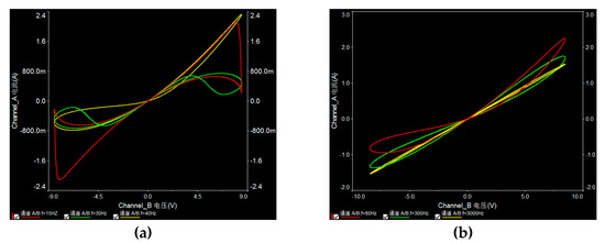 Figure 3. Multisim simulations of pinched hysteresis loops of the AM emulator under an applied sinusoidal input with different frequencies: (a) f = 15 Hz, f = 3 0 Hz, and f = 40 Hz; (b) f = 80 Hz, f = 300 Hz, and f = 3000 Hz.