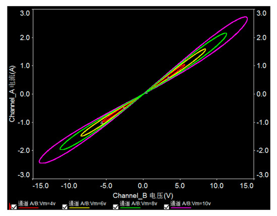 The evolution of pinched hysteresis loops of the AM emulator was obtained, as shown in Figure 4, with the frequency f = 650 Hz and different amplitudes Um = 10 V, Um = 8 V, Um = 6 V, and Um = 4 V. It can be seen from the figure that the pinched hysteresis loop of the memristor was compressed and the shape remained unchanged as the amplitude of the applied voltage signal decreased, with the frequency f = 650 Hz. The Multisim circuit experiment indicated that the features of the memristor depend on the amplitude and frequency of the applied voltage.