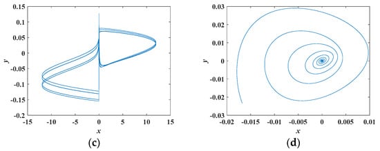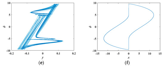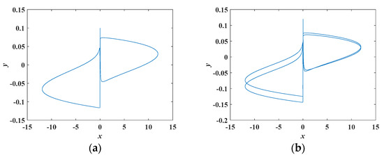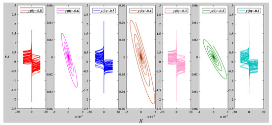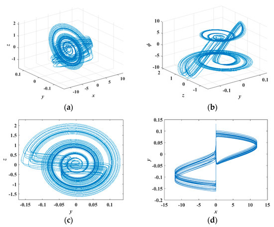 Equation (14) is invariant when state variables (x, y, z, φ) are transformed into (−x, −y, −z, −φ), i.e., Equation (14) is symmetric with respect to the origin O (0, 0, 0, 0). Let the parameters of Equation (14) be set as in Table 1, and the phase diagrams of the typical attractors are obtained, as shown in Figure 8 with two symmetrical initial conditions, (0, 2, 0, 0) and (0, −2, 0, 0). It can be seen from Figure 8 that each of the two attractors is asymmetric, and that they are symmetric to each other with respect to the origin.