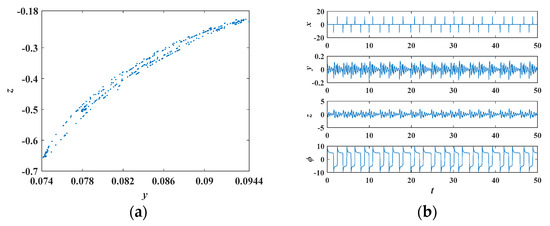 Figure 7. (a) Poincaré mapping on the (y, z) plane; (b) the time domain waves of the states x, y, z, and φ.