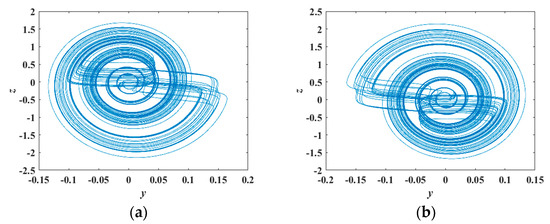 Figure 8. Projections of the attractors on the (y, z) plane with different initial conditions: (a) (0, 2, 0, 0); (b) (0, −2, 0, 0).