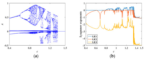Figure 9. Dynamics of the system with the parameter c (0.4, 1.5): (a) bifurcation diagram; (b) Lyapunov exponents.