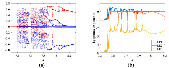 Figure 11. Dynamics of the system with the varying parameter a: (a) coexisting bifurcation diagram; (b) Lyapunov exponents.