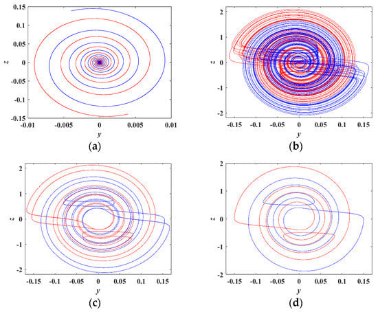 Using the phase diagram, the evolution of the coexisting attractors was analyzed with the varying parameter a. Several coexisting attractors were obtained, as shown in Figure 12, with different initial conditions (0, 0.001, 0, 0) and (0, −0.001, 0, 0). The attractors from initial conditions (0, 0.001, 0, 0) are painted red and the counterpart from (0, −0.001, 0, 0) are blue. It can be seen from Figure 12 that the coexisting attractors evolved from a pair of symmetrical point attractors to symmetrical chaotic attractors, then to a period-2 attractor pair, and finally to a period-1 attractor pair. This is consistent with the dynamics of the system in Figure 11.