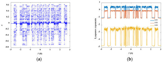 Figure 14. Dynamics of the system with y(0) (−3, 3): (a) bifurcation diagram; (b) Lyapunov exponents.