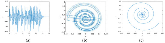 Figure 15. The transient phenomenon of the system: (a) the time-domain wave of the state y; (b) the attractor with the time duration t = 0–23; (c) the attractor with the time duration t = 23–30.