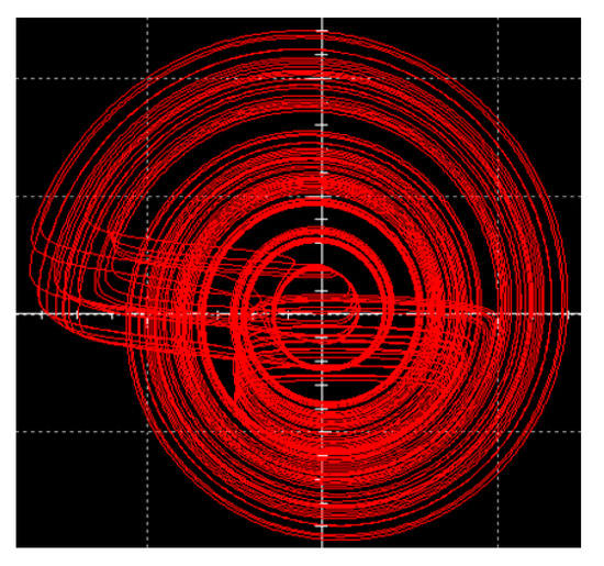 Let the parameters of Equation (14) be fixed as in Table 1, and a novel attractor is found in Equation (14), as shown in Figure 6, with the initial conditions (0, 0.001, 0, 0).