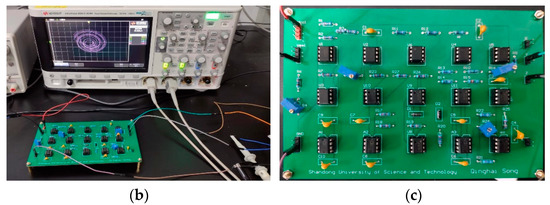 Figure 18. The experimental results of the memristive chaotic system from the physical circuit: (a) the typical chaotic attractor from the oscilloscope; (b) experimental platform; (c) the corresponding circuit board.