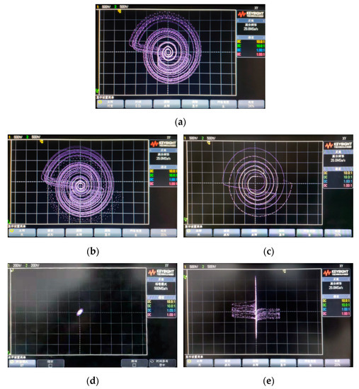 Figure 19. Digital signal processing (DSP) implemental results of the chaotic system: (a) the typical chaotic attractor; (b) the coexisting chaotic attractor; (c) the coexisting period-1 attractor; (d) the point attractor; (e) the typical chaotic attractor.