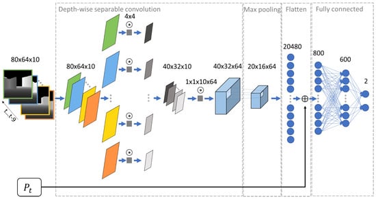 Based on the current location estimation, the distance and angle between the robot and the goal position are calculated and expressed in polar coordinates. This information is required for goal orientation, but consists of direct numerical data that are different from the depth images. Consequently, the mixed-input approach is utilized. We added the polar coordinates as a separate input that bypassed the depth-wise separable convolution part of the network. This input is directly concatenated with the flattened layer. Further, two fully connected layers follow. The latter layer is connected to an output that produces the two values of and v. In the case of a critic network, the action from the actor network is added in the second fully connected layer, which is connected to a single output producing the Q-value of the state. The full network is shown in Figure 2.