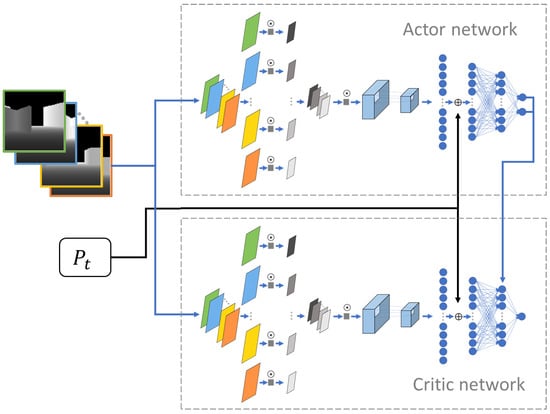 Currently, deep learning has shown great progress in dealing with large scale input data and directly producing finely-tuned policies in various applications, such as playing video games [25,26,27], stock market analysis [28,29,30], as well as various implementations in robotics [31]. Deep learning networks have been used in robotic applications to learn the navigation, as well as collision avoidance from the input signals [32,33,34,35,36]. Several applications have been developed that directly obtain motion policies from raw images [37,38,39]. Here, the motion policies are a direct result of the input image and do not require fine-tuning by an outside source. In [39], a dueling architecture-based Deep Double Q Network (D3QN) was used to obtain depth predictions from a monocular depth camera and perform collision avoidance. The network aims to avoid obstacles, but navigates without a specified goal position. Additionally, the D3QN algorithm outputs are in a discrete action space, which can result in rough navigation behaviors. In [40], the authors proposed a deep reinforcement learning model that separates the navigation towards a goal and the collision avoidance. The proposed two-stream Q network model learns the goal navigation and collision avoidance tasks separately, and the given actions are combined using an action scheduling method. The proposed approach uses a 360 laser range finder as the input and outputs actions in a discrete action space. Predetermined heuristics are used to decide the switching between navigation and obstacle avoidance actions. For the deep reinforcement learning to be capable of producing outputs in a continuous action space, the authors of [41] proposed a Deep Deterministic Policy Gradient (DDPG) network. This network was extended for map-less navigation purposes in [33] as an Asynchronous Deep Deterministic Policy Gradient (ADDPG) network. Here, measurements from a laser scanner in 10 directions and estimated robot location are used as the environmental information to navigate the robot towards a goal. A 180 laser sensor must be installed on the robot, and the state input considers only the current state of the robot. Laser sensor inputs are easily implementable in deep learning networks, especially if the number of inputs is reduced to minimize the number of learning parameters. However, they might not reflect a sophisticated scene in the environment since they generally produce information at a set height and have difficulties navigating around objects of certain shapes, as we show in Section 5.