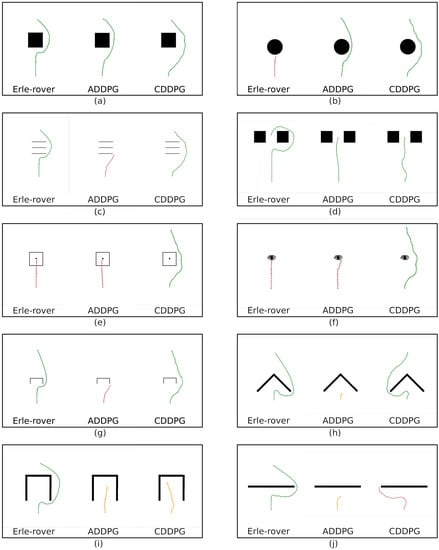 The main advantage of using input data from depth images is a more thorough scene representation. To show the benefit of a more complex representation of the environment through depth images over laser readings, avoidance around obstacles of varying complexity was explored. Naturally, a laser scan will only detect obstacles that are detectable on its plane, and a collision will occur with obstacles that cannot be perceived. However, also the geometrical composition of the obstacle can be a problem for laser-based obstacle avoidance, especially if sparse readings are used. Therefore, we performed comparison experiments of navigation around simulated objects of different compositions. This is portrayed in Figure 4. The robot had to navigate around the obstacle to a location behind it. In Figure 4d, the robot’s task was to navigate to a location between the two obstacles. From Figure 4, we can observe that sparse image readings had difficulty navigating around obstacles that did not have a solid shape. The sparse readings would register the distance to an obstacle at one time step, but after motion, would not register the obstacle at the next step. Here, a part of the obstacle would be located between the laser readings as is the case in Figure 4f, where the laser read the gap between the legs of a human and perceived it as a safe direction to move. A special case is depicted in Figure 4e, where a coffee table surface was located on a pole. The laser-based approaches could not perceive the narrow pole as an obstacle. On the contrary, the depth image collision avoidance could recognize the full shape of the obstacle and navigate around it. In the case of Figure 4h, the lack of local memory in ADDPG forced the robot to turn away and again towards an obstacle in consequent moves, thus freezing the robot and forcing it into a deadlock. However, such a situation could occur for our method as well if the robot finds itself in a situation where no improvement of the current location can be made over the span of its memory. This is portrayed in Figure 4i. Here, after navigating into the pocket, the robot would constantly turn for 10 steps in one direction and then 10 steps in the other in order to find a direction of safe movement. Since it was unable to find a safe direction, it was perpetually stuck in this motion. Due to the field of view angle restrictions of a single camera, our method may lack peripheral vision, which may lead to a collision in certain circumstances, as is depicted in Figure 4j. The robot navigated around an obstacle until it was not in view and began to turn. Since it was necessary to perform a large turn, the stack did not hold depth images of the obstacle and lost information about its location in relation to the robot.