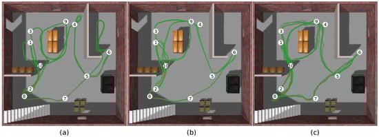Validation odometry information in a simulated environment. Numbers depict the sequence in which the robot needs to navigate to designated points. The green path visualizes the trajectory of each respective method. (a) Experimental results of the Erle-rover laser-based method. (b) Experimental results of the ADDPG sparse laser-based method. (c) Experimental results of the CDDPG depth image-based method.