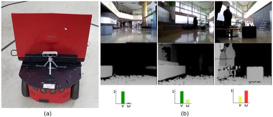 (a) Robot setup for experiments in a real environment. (b) Example of network outputs in a real environment. An RGB image is shown for visualization purposes, and the proposed network uses only provided depth images. v represents the linear and angular velocities, respectively. One represents the maximal possible value of the respective velocity.