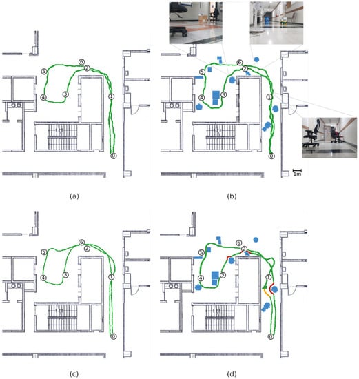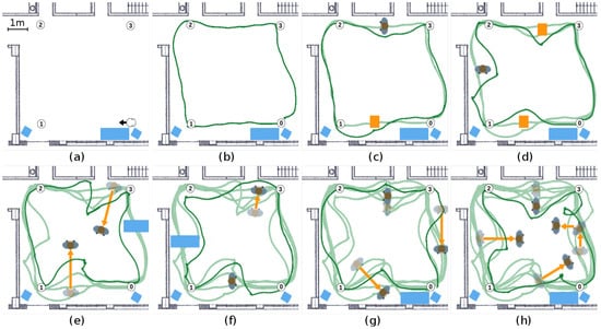 Results in the dynamic environment. The green path depicts the robot’s movements from odometry data. Blue shapes depict obstacles already in the scene, and orange shapes depict newly introduced obstacles. A human obstacle was introduced in the scene, and if it was in motion, its opaque shape designated the starting position of the motion. The motion direction is visualized by an orange arrow. Numbers from 0 to 3 describe the locations and sequence of the target goals. (a) Layout of the experiment environment. (b) Experiment without obstacles. (c,d) Experiments with new static obstacles. (e,f) Experiments with relocated static and dynamic human obstacles. (g,h) Experiments with dynamic human obstacles.