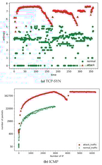 (a) Average entropy of source ports per each IP address; (b) Logarithm of number of ICMP packets per each IP address.