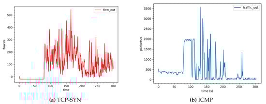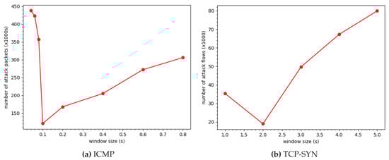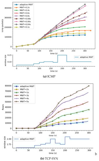 As can be seen in Figure 9a,b, the number of malicious ICMP packets and the number of TCP flows that get through the gateway to the destination vary depending on the monitoring window time. If adaptive window size is applied as described previously in Section 5, which is visible in the lower part of the figures, then the system can block malicious traffic most efficiently. It is also worthwhile to note that too large or too small window sizes, e.g., s or s as shown in Figure 9b, are not the optimal values for the best mitigation efficiency.