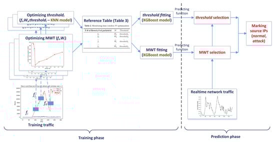 Figure 7 shows the DDoS mitigation process for incoming traffic based on machine learning deployed in this work. There are two operational phases in the model, namely the training phase and the prediction phase. During the training phase, the monitoring window size as well as the corresponding threshold are defined based on the information extracted from the training traffic. We then develop prediction functions that are used in the prediction phase for mitigating malicious real incoming traffic. The process is descried in detail below.