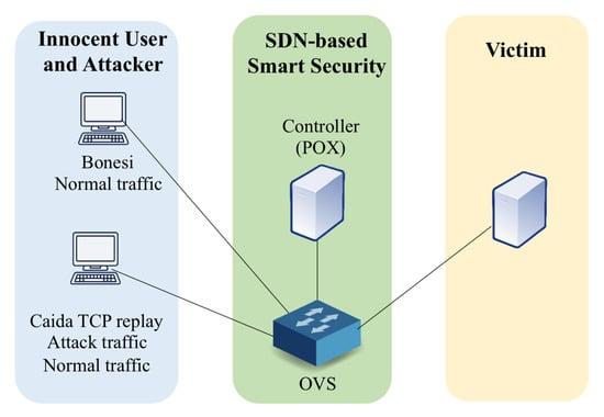 In order to evaluate the performance of our approach, a testbed is deployed as shown in Figure 8, which includes POX [39] as the SDN controller, OpenVSwitch (OvS) [40] as the SDN-enabled switch, a normal user, attack traffic replay machine, and the victim. We use TCP replay to replay the CAIDA attack traffic while using Bonesi [34] to generate both innocent and attack NATed IP traffic with opened ports in different experimental scenarios. The configurations of the testbed are shown in Table 6. MWT is adaptive by using the method discussed above. For the sake of simplicity, only results from the CAIDA 2007 dataset are mostly shown and discussed as they are more complex, and the results from the Bonesi dataset generated in our testbed also support the same findings of this work.