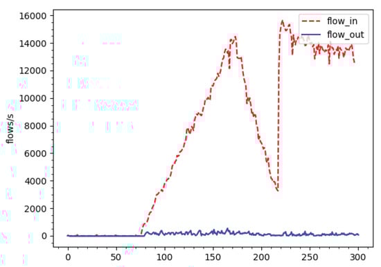 Figure 10 shows the number of TCP flows entering (flows_in as red dashed line) and flows exiting (flows_out as blue solid line) the system in a second, where flows_in include normal and attack traffic. As can be seen in normal condition, from the 0th second to 75th second, the system lets all flows through, no flow is dropped. In the attack phase, after the 75th second, the number of flows_in increases to 15,000 flows per second but flows_out are approximately 700 flows. That means the attack is restricted by the proposed mitigation algorithm, most of the attack flows are dropped.