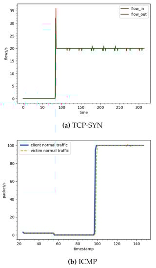 Figure 12a presents normal arrival and departure TCP traffic at the gateway, where the red line is the volume of TCP traffic that enters the system in flows/s, and the green line is the TCP traffic that is delivered to the victim. The result shows that most of normal traffic flow is delivered to the victim. The same is also applied for ICMP traffic as presented in Figure 11b and Figure 12b. Overall, the experimental results in Table 9 confirm that our proposed approach can efficiently mitigate TCP-SYN Flood and ICMP Flood attacks up to more than to and respectively while normal traffic is almost not affected. In addition, the SDN-based Smart Security gateway (Figure 8) is robust against TCP-SYN Flood attack, ICMP Flood attack as the time window size is adapted automatically. The SDN controller is also protected from attack traffic and stays operational when the new mitigation model is applied.