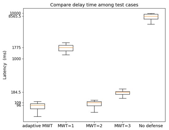 Finally, Figure 13 shows five boxplots of the latency of innocent TCP users under TCP-SYN attack in 5 cases: (1) ; (2) ; (3) ; (4) no mitigation method is applied; and (5) adaptive window size. Each bar represents the maximum and minimum, the average (orange line) and the 50-percentile (the box) of latency. When the system does not use any DDoS mitigation method, only a small part of innocent traffic can come through with very high latency (average from to ). As TCP-SYN mitigation is deployed with fixed window size larger than the average of the adaptive window size (—see Figure 9b), most innocent traffic can get to the destination with the latency around . This implies that our mitigation approach can greatly improve the system performance. However, larger window size causes larger latency, as the controller should receive more inquiries within a window that leads to over-utilization. When the window size is too large, the controller is overloaded by too many malicious incoming requests. On the other hand, a window size smaller than the average of the adaptive window size (e.g., in our experiment) decreases the accuracy of the mitigation algorithm, as the controller does not collect sufficient information to decide if a source IP is a malicious one. Consequently, some attacks can get through that increases the latency of innocent traffic, which is as high as . On the contrary, in case adaptive window size is used, normal traffic can come through with the smallest latency, around 0.1 s.