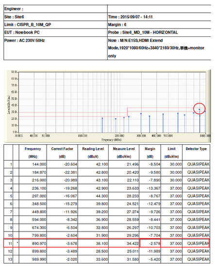With respect to the test project of high definition multimedia interface (HDMI) electromagnetic interference (EMI), the product can meet the standard in the design stage, but not satisfy the requirements specified for mass production, which forces the production line to be suspended. Even worse, in some cases, it is necessary to redesign the product, which is not desired by the company. Usually this problem arises from the design stage. The engineers fail to give full consideration to the potential impact of electromagnetic interference, and the choice of countermeasure is unavailable. In addition, these problems result from the design flaws and also from the countermeasure selection. In terms of a general EMI verification project, test results are usually restricted to below the regulatory limit of −0 dB, but the error value can exist in the practical measurement. Therefore, it is essential to identify a proper countermeasure for these factors to be avoided.