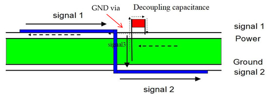In addition to eliminating the interference of signal line through holes and other signal lines, it is also necessary to take into account the conditions of the return path when the signal lines cannot refer to the same reference plane (GND). In general, a decoupled capacitor is employed, or a reference plane is added to achieve reinforcement by the nearby signal line through hole, as shown in Figure 6.