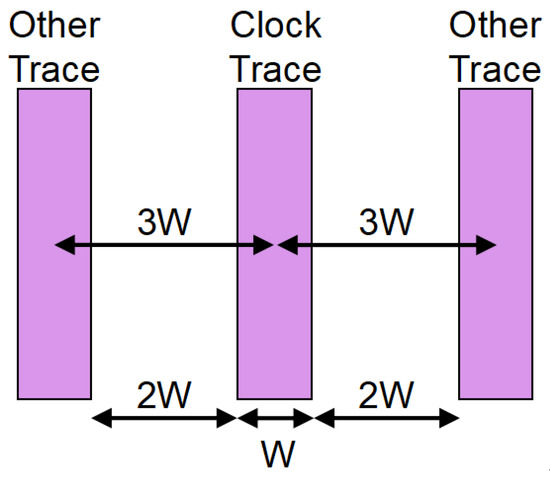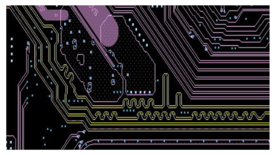 Therefore, it is a necessity that the 3W rule is adhered to as much as possible as part of the wiring requirements [7]. The clearance between lines should be three times the width of lines, as shown in Figure 7. It should be measured by midline, or the clearance between lines should be twice as wide as a single line, and snake-like wiring needs to be reduced, as marked in yellow in Figure 8. In addition, for the signals with high speed and high sensitivity, it is necessary to avoid the clock or the power of the through hole as much as possible. It is also necessary to avoid the front end of the HDMI port and the HDMI signal online. Meanwhile, the PCB factory production line and the line testing point must be detected. If the PCB itself with HDMI signal noise has the opportunity to couple radiation to an HDMI port, what is borrowed from HDMI cable will noise out the screen and join in the high-speed signal transfer layer path GND via design. Moreover, the GND via advice from a signal line shows a penetration hole distance of 25 mil, which makes it necessary not only to shorten the return path and area but also to reduce the formation of the radiation field. These issues affect EMI test results on a frequent basis.
