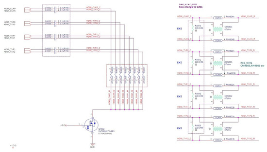 The HDMI circuit diagram, for this paper, is shown in Figure 13, and the HDMI circuit layout is marked as yellow in Figure 14.