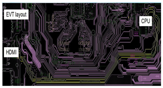 With regards to the specifications of HDMI 1.4, its resolution is supposed to support 4K2K with 30 Hz refresh rate. However, according to the verification requirements specified by the customer, HMDI noise at 891 MHz frequency is frequently incapable of meeting the customers’ requirements for EMI of –6 dB, as shown in Figure 2. * means that the customers’ requirements. The 891 MHz frequency point is merely −2.578 dB. Although the measurement results comply with the EN55022 regulations, they do not conform to the customers’ requirements. Therefore, this paper presents a practical study of a printed circuit board (PCB) layout based on satisfying customers’ requirements for HDMI noise.