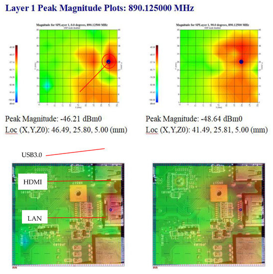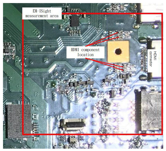 As revealed by the PCB EMI measurement results, the measured spectrum of only HDMI at 297 MHZ and 891 MHZ EMI energy is strong, as shown in Table 1. While the original design meets the requirements of the laws and regulations, it cannot satisfy the requirements of customers’ demand for a limit of –6 dB. Therefore, the EM—ISight for the near field measurement is applied, and the measurement area is shown in Figure 15. The red box marks the HDMI, and almost every intensity distribution is shown in Figure 16.
