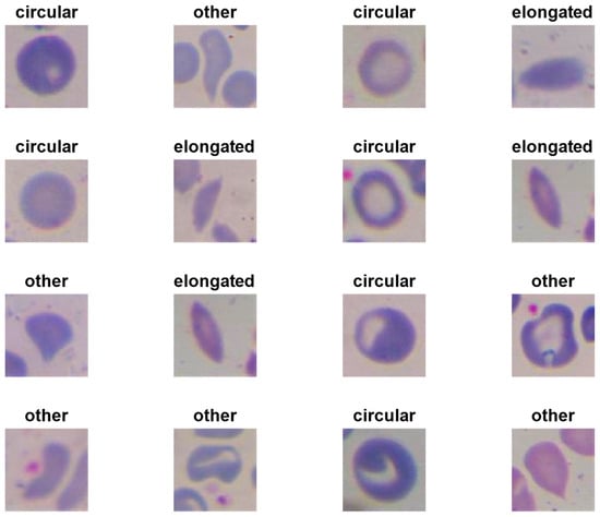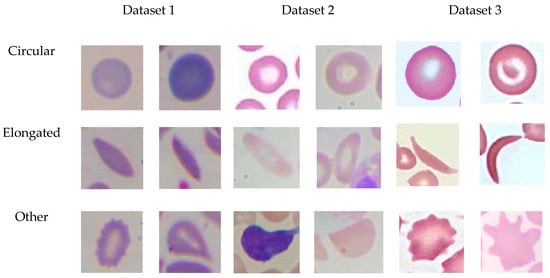 The erythrocytesIDB dataset has images of peripheral blood smears samples taken from patients with Sickle Cell Disease in the Special Hematology Department of the General Hospital from Santiago de Cuba []. It has images of three tasks (segmentation, detection, classification), and we work on the first task, which is the classification (erythrocytesIDB1). The dataset has 196 full-field images with 626 images of individual cells classified as circular (202), elongated (211), or other (213). Each cell has a size of 80 × 80 pixels. Figure 1 shows the samples of individual cells of the dataset.