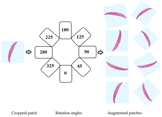 The second solution is performing data augmentation []. Data augmentation is a process to increase the amount of training data to enhance classification performance. The augmentation process is achieved by applying several transformations. In this paper, we have applied rotation with seven different angles (45, 90, 125, 180, 225, 280, and 325) as shown in Figure 3. We also applied two flipping techniques (horizontal, vertical) and two different brightness degrees. The original images have been duplicated 11 times. Data augmentation and transfer learning aid to prevent the overfitting issue, since they both offer a large amount of data. The overfitting issue will occur if the CNN model has more learning capacity than the dataset has information. However, our proposed models are shallow, which aids in avoiding the overfitting issue.