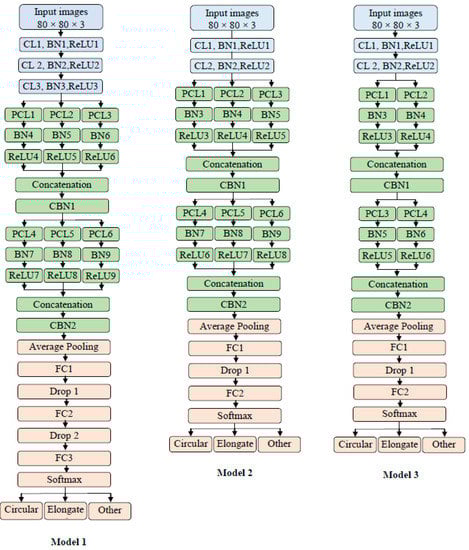 This model consists of 40 layers in total with nine convolutional layers. Each convolutional layer in the model is followed by batch normalization and Rectified Linear Unit (ReLU) to speed up the training process and to prevent vanishing gradient problem. At the beginning of the model, three traditional convolutional layers are used with filter sizes (1 × 1, 3 × 3, 5 × 5) to reduce the size of the input image. The output of traditional layers feeds to the first block of parallel convolutional layers. This block consists of three convolutional layers with filter sizes (1 × 1, 3 × 3, 5 × 5). These parallel convolutional layers are working together; then, the outputs concatenate in the concatenation layer, which is followed by the batch normalization layer. The output of the first block passes to the second block of parallel convolutional layers, which is the same structure of the first block. After that, the output of the second concatenation layer passes to the average pooling layer to reduce the dimensionality. Three fully connected layers have been employed, and two dropout layers are between these fully connected layers to avoid overfitting []. Lastly, the softmax function is utilized to yield the classification output. All the details of the architecture of Model 1 are explained in Figure 4 (model 1) and Table 1.