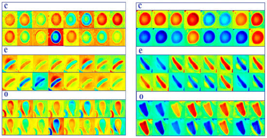 Some of the learnable filters from Model 2 trained with Scenario 4. c represents circular, e represents elongated, and o represents other. The first column is learnable filters from the first convolutional layer; the second column is learnable filters from the second convolutional layer.