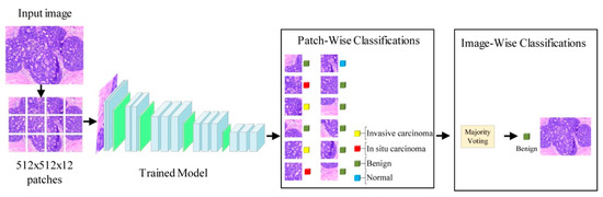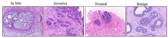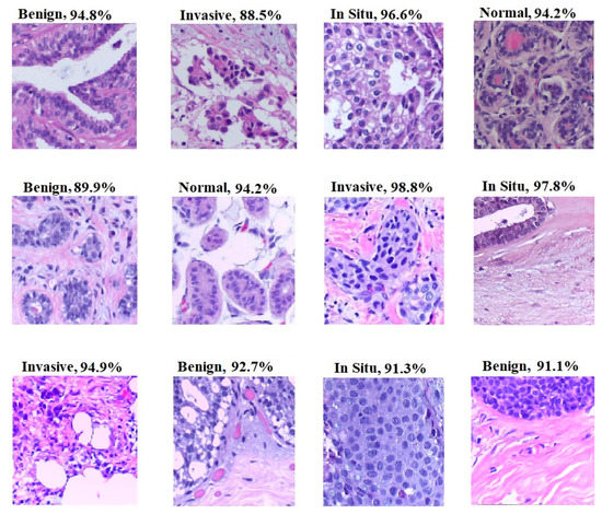 - The proposed model has been utilized to classify hematoxylin–eosin-stained breast biopsy images into four classes, namely invasive carcinoma, in-situ carcinoma, benign tumor and normal tissue. The performance of the breast classification task has been significantly improved in terms of accuracy, and has surpassed the performance of the latest methods by achieving an accuracy of 96.1% in classifying test images of the ICIAR 2018 dataset [16].