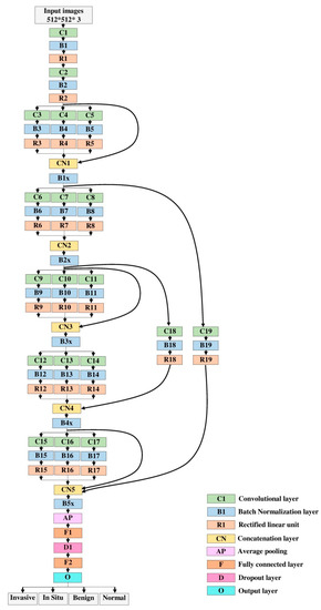 | O (Softmax function) | Invasive, In situ, Benign, Normal | 1 × 1 × 4 |