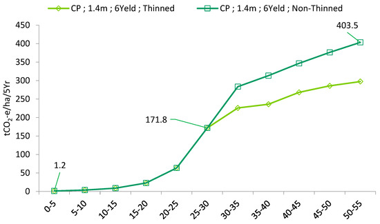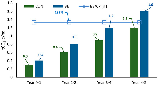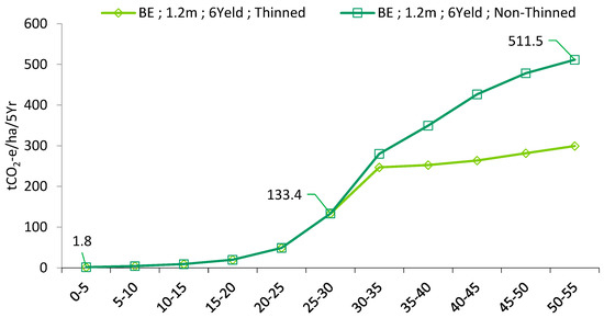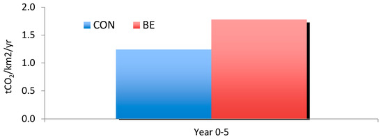 It can be seen from Figure 2 that in the first 5 years BL is able to sequester more than CON; namely, an average of 133%/year over the course of the first five years. Especially one year after establishment, one hectare of BE is able to sequester 167% more CO2 than the CON. The lookup tables also consider tree thinning. In our case, we do not consider that, because according to the data, it is performed after the first 5 years, while the focus of this work is the first five years [97]. Nevertheless, the existing data also shows that the highest CSS capacity occurs while the trees are not yet mature, up to 35–40 years, and still, from a CO2 sequestration capacity perspective, BL is superior to CON over that period, as shown in Figure 2, Figure 3 and Figure 4, illustrating the thinning effect on CO2 sequestration, which basically does not exist until right before a tree becomes mature, at around 25–30 years old [97]. As such, that effect is not considered in this work.