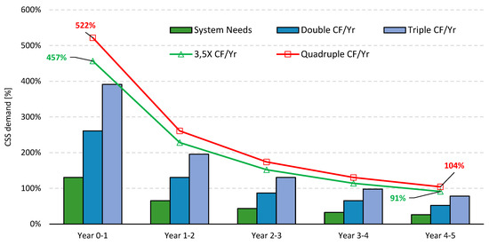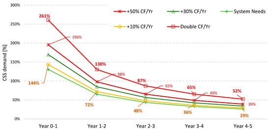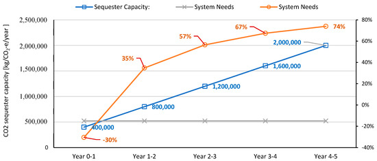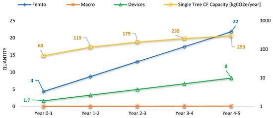 This means that the CO2 storage capacity increases, but only to a certain degree. When the tree becomes older, its storage capacity ceases increasing and remains constant. Nevertheless, as it will be shown in this work, this depends on the type of tree and happens two or three decades after the tree has been planted [83,84,85]. Table 1 presents the breakdown in percentages of the total system CF and an estimate each for 2020 and 2025, considering a linear increase of 11 MtCO2-e per year.