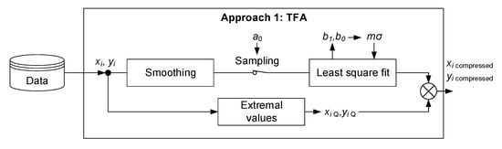The first compression methodology is called the TFA (triangular function algorithm). It encloses the following steps. (I) Import the whole dataset and choose preferred percentiles (e.g.,: , ). (II) Determine percentiles and store these data points . The remainder of the dataset will be smoothed by the moving average filter. (III) Read a step width of data points. (IV) Perform a least square fit to generate the intercept and slope , see Equation (1).