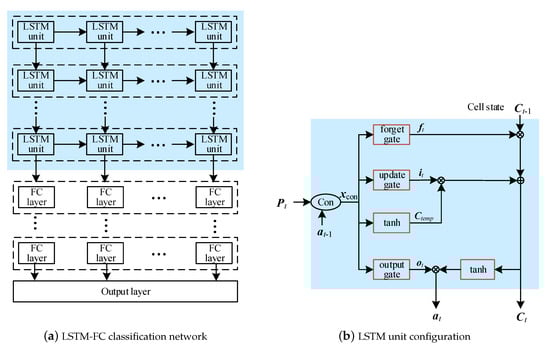 Temporal LSTM (long short-term memory)-FC (fully connected) classification network (a) and unit configuration (b).